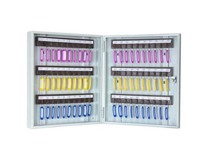 Ключница КЛ-60 предназначена для хранения 60 комплектов ключей. На задней стенке корпуса расположены отверстия для крепления. Ключница комплектуется 6 планками под навеску ключей. В дверь установлен замок типа «Cam-Lock». По желанию заказчика ключница может комплектоваться брелоками. Цвет: Серый.