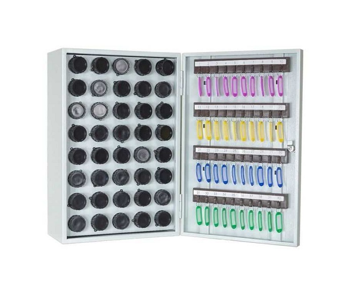 Пенальница КЛ-40П предназначена для хранения 40 комплектов ключей и 40 пеналов. На задней стенке корпуса расположены отверстия для крепления. Ключница комплектуется 4 планками под навеску ключей. В дверь установлен замок типа «Cam-Lock». По желанию заказчика пенальница может комплектоваться пеналами. Цвет: Серый.