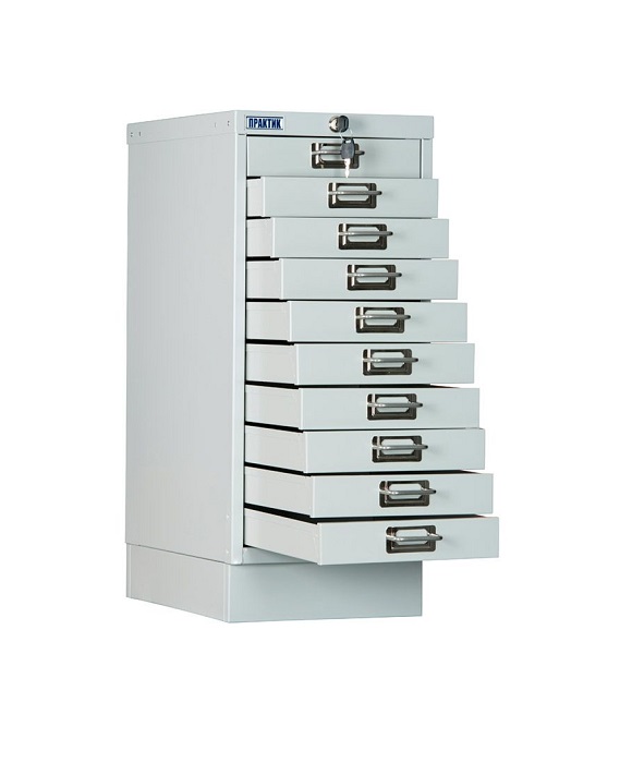 Многоящичные шкафы предназначены для систематизации и удобного хранения документов формата А4, канцелярских принадлежностей и мелких предметов Комплектация - цельный сварной корпус (1мм), 10 выдвижных ящиков, центральный ключевой замок, каждый ящик комплектуется информационной табличкой Размеры внешние, мм (ВхШхГ) 650x277x405, внутренние размеры ящика, мм (ВхШхГ) 50x239x367, Цвет Серый полуматовый (RAL 7038), Тип покрытия Порошковое, антикоррозийная обработка