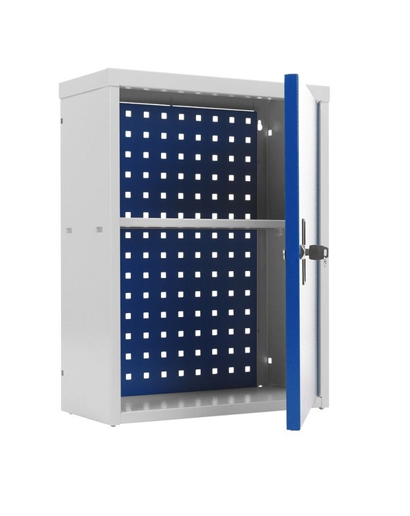 Шкаф Profi WD предназначен для хранения мелкого инструмента и принадлежностей в слесарной мастерской. Максимальная нагрузка на шкаф до 20 кг. Задняя стенка шкафа представляет собой перфорированный экран с квадратной перфорацией 10х10 мм. Шкаф комплектуется полкой. Двери закрываются ключевым замком с ручкой. Возможна смена стороны открывания. Цвет синий