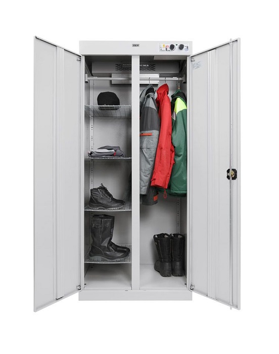 Шкаф предназначен для сушки мокрой или влажной рабочей одежды, спортивной формы, белья, обуви. Используются на буровых, на нефтяных станциях, на строительных площадках, в военизированных подразделениях, в ледовых дворцах. Изготовлен из сборно-разборного жесткого корпуса, который сопоставим или даже превосходит по параметрам цельносварной шкаф. В комплектацию шкафа входит 4 полки-сетки, которые выдерживают нагрузку до 10 кг, перекладина для вешалок на всю ширину шкафа, фланец для отвода воздуха, два регулятора температуры и времени, индикатор времени окончания работы, таймер на 4 часа/ температура 60 градусов, вентилятор с мощностью 2500 Вт и производительностью 180 м3/ч, надежный замок CyberLock CLx3P AM1 556-91 с двухсторонней ригельной системой запирания на 2000 комбинаций. Технические характеристики шкафа: механическое управление, напряжение 220 В, частота 50 Гц, потребляемая мощность 1275 Вт, уровень шума 45 дБ, длина кабеля 300 см, диаметр фланца 125 мм. Цвет серый шагрень RAL 7038. Поставляется в разобранном виде