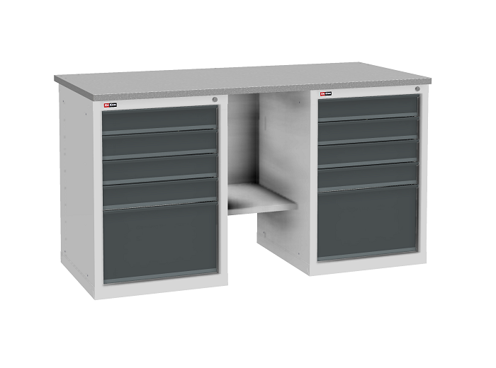 В комплектацию верстака входит: столешница ВЛ-К 150, полка и стенка ВЛ-К, две тумбы ВЛ-К-015. Столешница выполнена из фанеры (24 мм) с покрытием из оцинкованного листа металла. Тумба ВЛ-К-015 комплектуется 5 выдвижными ящиками с телескопическими направляющими. Полезный размер ящиков (ВхШхГ): 1-280х459х459 мм, 4-80х459х459 мм. Тумба закрывается центральным ключевым замком (50 000 циклов).