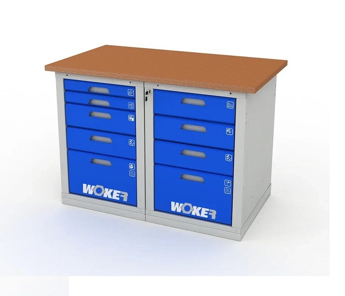 В комплектацию верстака входит: столешница Woker 1200, одна тумба Woker 04, одна тумба Woker 05. Столешница выполнена из шлифованной березовой многослойной фанеры толщиной 30 мм. Снаружи фанера обработана влагостойким антисептиком цвета "красное дерево", что придает фанере повышенную влагостойкость и более темный цвет. Тумба Woker 04 комплектуется 4 выдвижными ящиками (3 высотой - 135 мм и 1 высотой - 275 мм). Тумба Woker 05 комплектуется 5 выдвижными ящиками (2 высотой - 135 мм, 2 высотой - 65 мм и 1 высотой - 275 мм). Полезный размер ящика: (ШхГ) 459х612 мм. В ящиках есть противоскользящие коврики и набор наклеек с пиктограммами для маркировки содержимого.