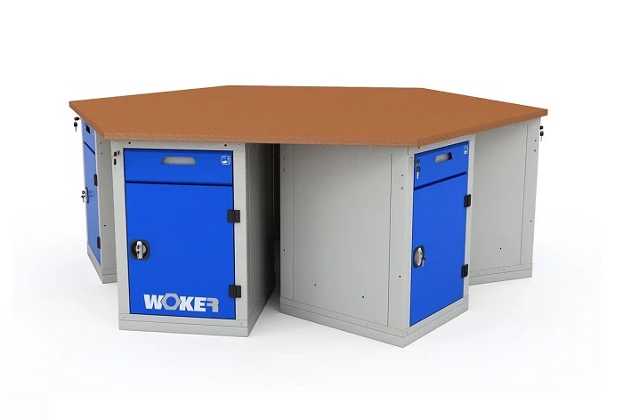 В комплектацию верстака входит: столешница Woker 2500, шесть тумб Woker 02. Столешница выполнена из шлифованной березовой многослойной фанеры толщиной 30 мм. Снаружи фанера обработана влагостойким антисептиком цвета "красное дерево", что придает фанере повышенную влагостойкость и более темный цвет. Тумба Woker 02 имеет одну регулируемую по высоте полку (шаг 50 мм) и один выдвижной ящик. Полка тумбы установлены на стальные салазки, которые позволяют выдвигать полку на себя на 70% для облегчения разгрузки/погрузки. Дверь тумбы закрывается на цилиндрический замок со стальной поворотной ручкой, секретность замка 2000 комбинаций. Открывание двери на 180 градусов. Полезный размер ящика: (ШхГ) 459х612 мм. В ящике есть противоскользящий коврик и набор наклеек с пиктограммами для маркировки содержимого.